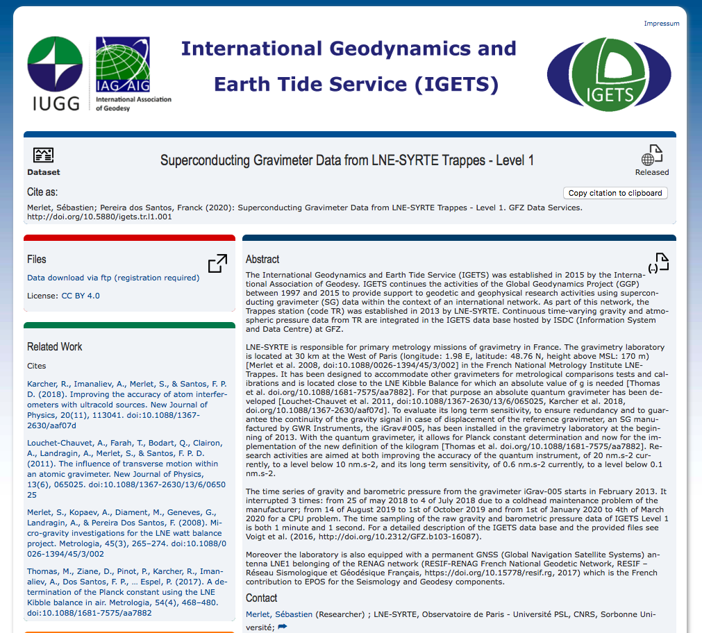 Gravimetric data from LNE-SYRTE are accessible on the national SNO database (http://igets.u-strasbg.fr/SG_france.php) and the international IGETS database (http://isdc.gfz-potsdam.de/igets-data-base/) hosted by the ISDC (Information System and Data Centre) at the GFZ in Germany.