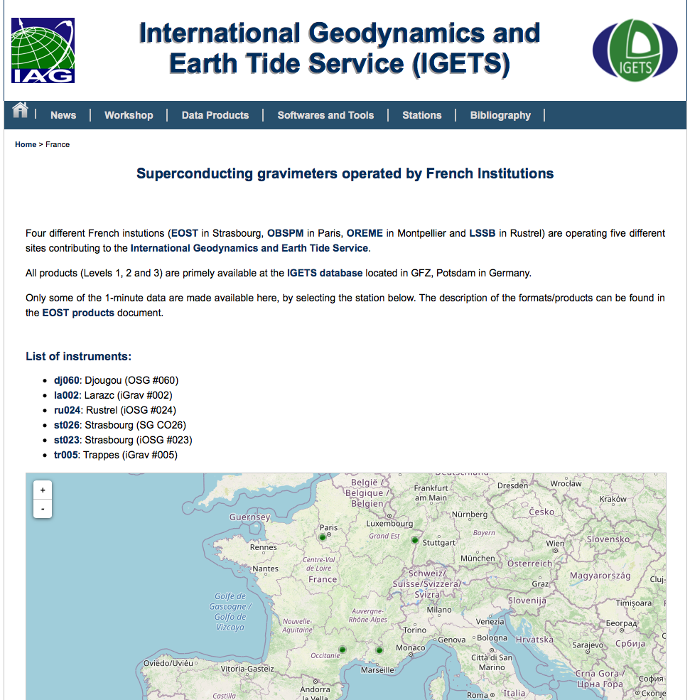 The SNO includes 2 main components : 1) a contribution to international scientific services of IAG (International Association of Geodesy) including the Bureau Gravimétrique International (BGI) and the International Geodynamics and Earth Tide Service (IGETS), and 2) a contribution to the monitoring of temporal gravity variations performed from a set of permanent observatories hosting superconducting gravimeters and from repeated absolute gravity measurements in about 15 sites in France and worldwide. The SNO is coordinated by the Ecole et Observatoire des Sciences de la Terre (EOST) in Strasbourg and its other partners are the Observatoire Midi Pyrénées Toulouse (OMP), the Observatoire de Recherche Méditerranéen de l’Environnement (OREME) and the Observatoire de la Côte d’Azur (OCA).