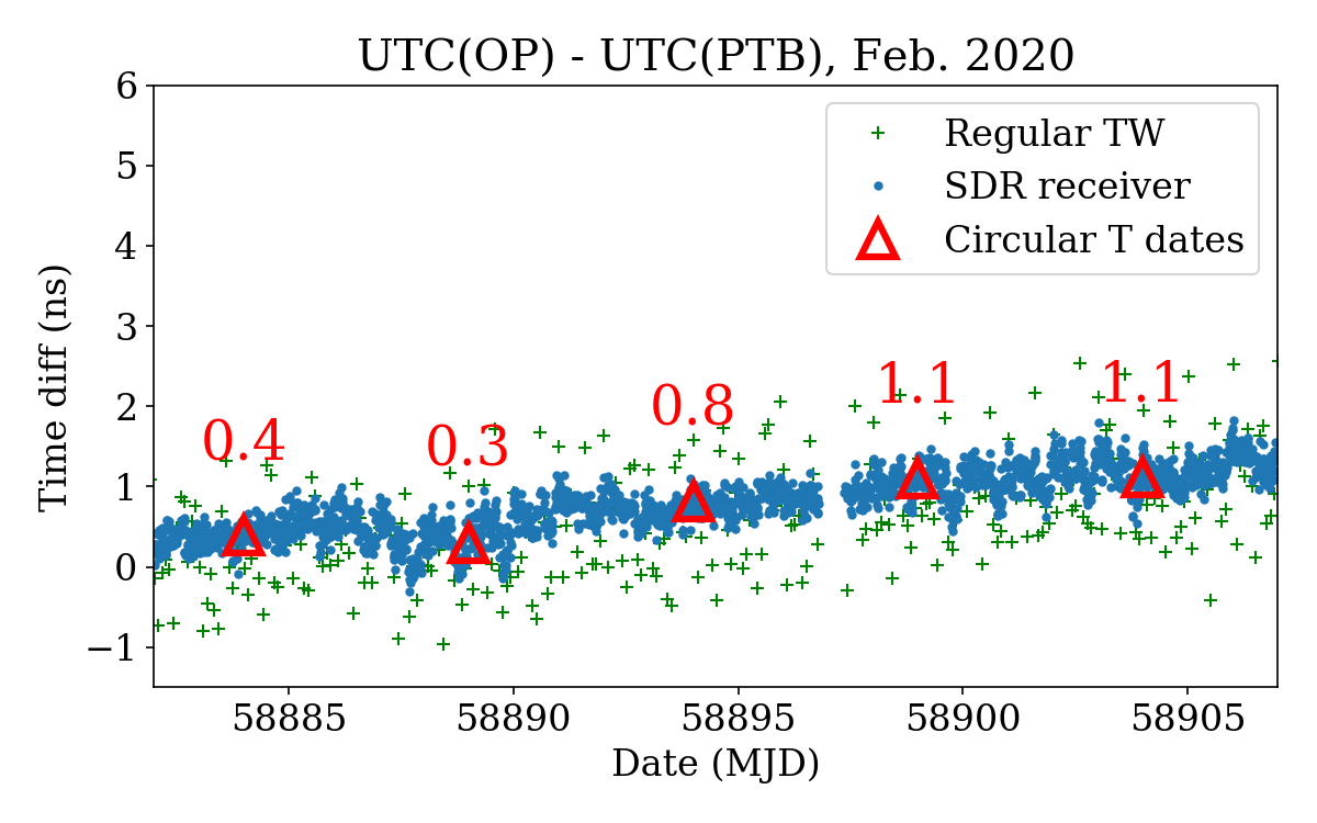 Time difference UTC(OP) – UTC(PTB), in nanosecond, as measured by regular TWSTFT link (green cross) and improved with Software-Defined Radio (SDR) receiver (blue dot). Source: BIPM, March 2020.