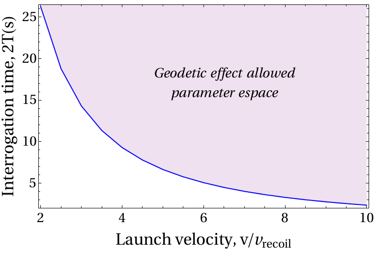 - Diagram v - 2T (launch speed-interrogation time) showing the 5% accuracy frontier in the measurement of the geodetic effect with an on-chip cold atom gyrometer, for a fixed integration time of 4 months.