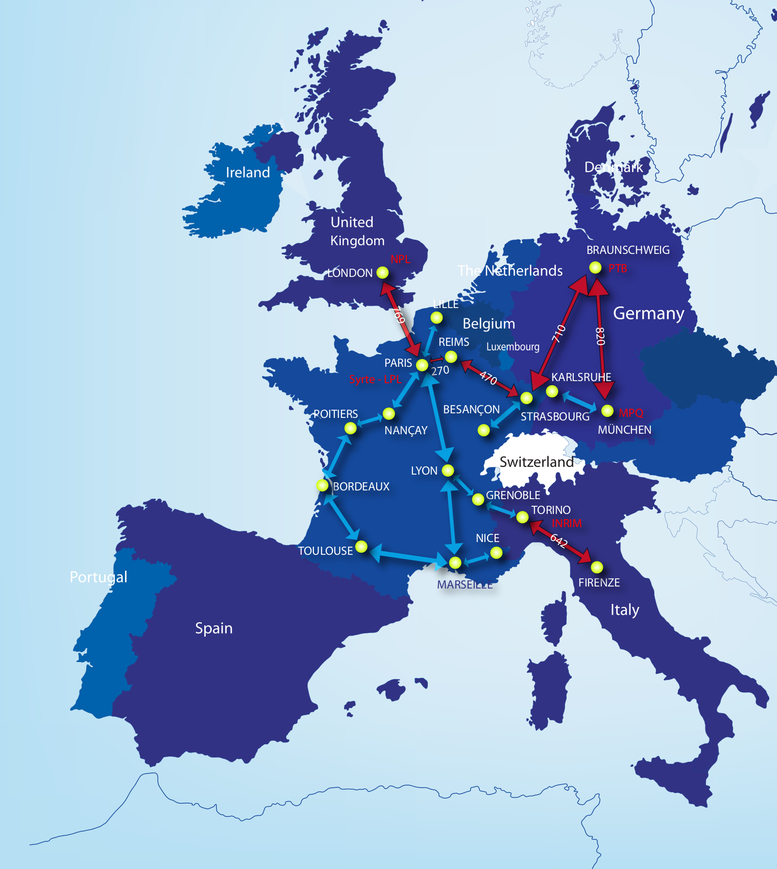 Nous avons établi une collaboration avec RENATER, le Réseau National de télécommunications pour la Technologie l’Enseignement et la Recherche, pour utiliser l’infrastructure du réseau académique national. Un équipement spécifique est malgré tout nécessaire, que nous avons installé (fin 2020) sur les lignes Paris-Reims-Nancy-Strasbourg-Besançon, Paris-Lille, Paris-Lyon-Grenoble-Modane. Nous avons également une liaison SYRTE-LPL-NPL. Ainsi le SYRTE est relié en optique à ses homologues allemands, anglais et italiens et le réseau français permet les intercomparaisons entre toute paire d’horloges hébergées chez ces 4 instituts de métrologie.
