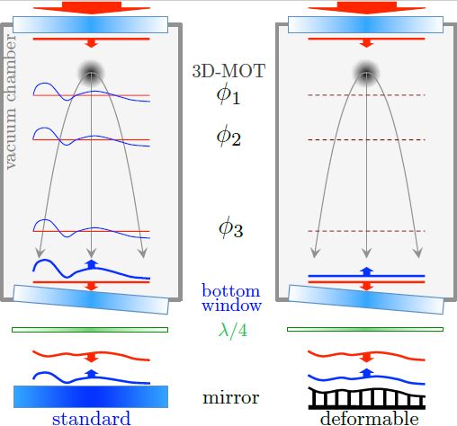 - Le faisceau laser entre par le haut dans l’enceinte à vide et en sort par le hublot du bas. On considère ici le front d’onde descendant (en rouge) comme parfaitement plat. Après réflexion sur un miroir standard (à gauche) ou un miroir déformable (à droite), il entre à nouveau dans l’enceinte à vide (en bleu). A gauche : le front d’onde montant est déformé par les aberrations du hublot du bas, la lame quart d’onde et le miroir. La différence de phase entre les faisceaux descendant et montant dépend alors de la position transverse. Elle est échantillonnée d’une façon différente au moment des trois impulsions de l’interféromètre à cause de l’expansion balistique des atomes, ce qui biaise la mesure. A droite : le front d’onde montant est corrigé par le miroir déformable. La différence de phase est alors uniforme et la mesure non biaisée.