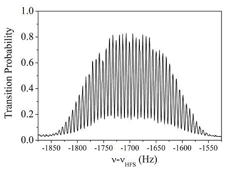 - Spectre Raman de la probabilité de transition entre |g> et |e> en fonction de la fréquence Raman νR. La présence de transitions à des fréquences Raman égales à la fréquence hyperfine plus un nombre entier de fréquences de Bloch (νB = 569 Hz pour notre système) sont la signature d’un déplacement des atomes entre les sites du réseau.