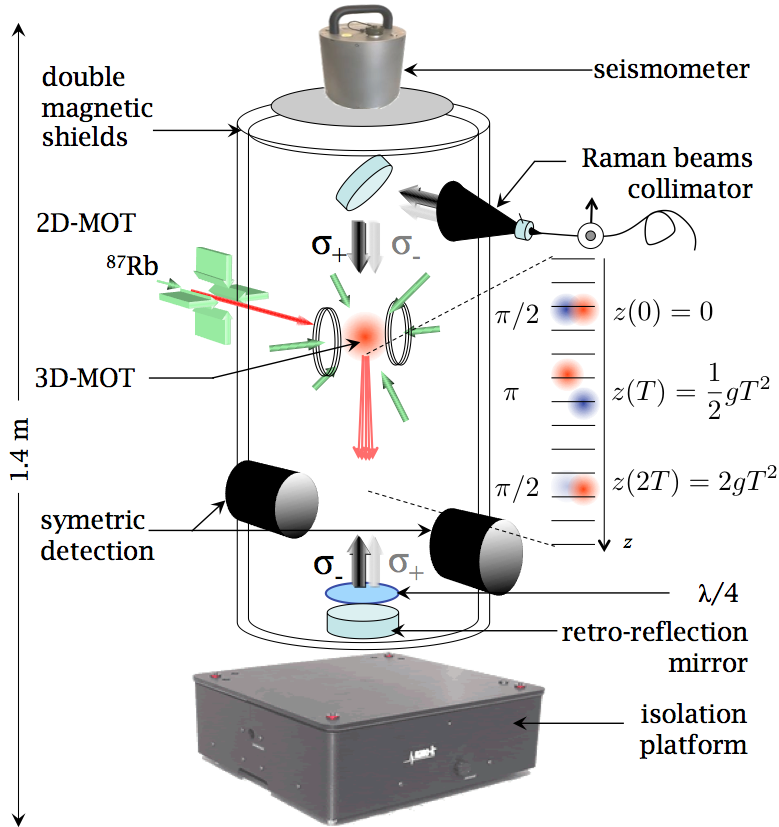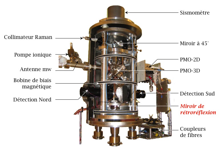 Le gravimètre absolu repose sur des techniques d’interférométrie atomique avec des atomes froids. Dans un premier temps, quelques 108 atomes sont capturés dans un piège magnéto-optique. Les atomes sont refroidis à une température de l’ordre du µK, avant d’être relâchés. Pendant leur chute libre, ils sont soumis à une série de trois impulsions laser, qui séparent et recombinent les paquets d’onde atomique. Finalement, le déphasage entre les deux bras de l’interféromètre, qui est proportionnel à g, est déduit de la mesure de l’état atomique en sortie de l’interféromètre.