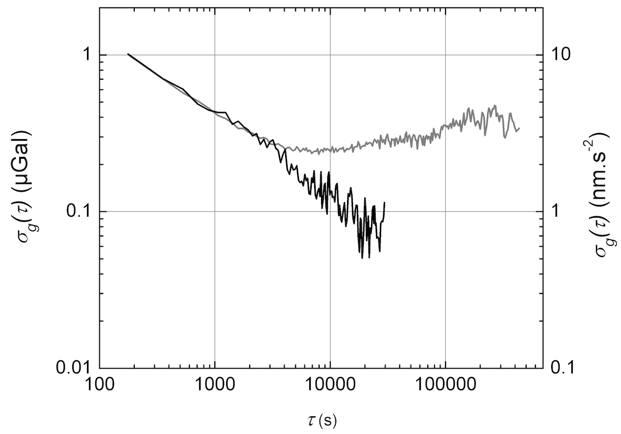 La sensibilité de notre instrument est limitée par les vibrations parasites. Nous avons mis au point une technique de réjection des vibrations originale, qui combine une isolation passive et une correction du bruit d’accélération du sol à l’aide d’une mesure indépendante réalisée avec un sismomètre très bas bruit. Cette technique nous permet d’atteindre une sensibilité de 5,7 × 10-9 g sur une seconde, soit près d’un ordre de grandeur de mieux que ne les permettent les gravimètres absolus classiques et ce en dépit d’une distance de chute des atomes relativement faible (inférieure à 20 cm seulement). Un tel niveau de performances permet à notre gravimètre de résoudre les faibles variations temporelles de g liées aux marées luni-solaires, mais aussi les vibrations du sol liées aux ondes sismiques lors de tremblements de terre. Un exemple de sensibilité long terme correspondant à la mesure d’un mois précédente est représenté en gris sur la seconde figure. La sensibilité « plafonne » entre 2 × 10-10 g et 4 × 10-10 g peu après 3000 s de mesure. L’analyse sur deux jours représentés en noir sur la mesure longue, montre que l’écart type d’Allan descend jusque 6 × 10-11 g