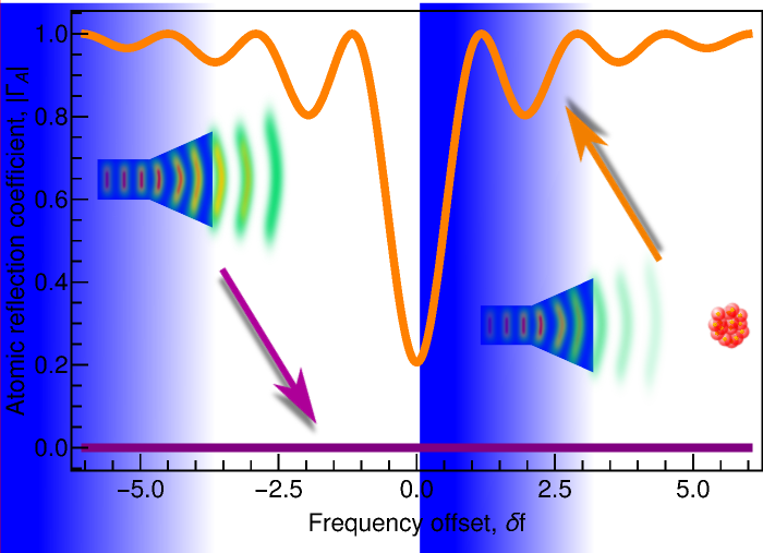 - Spectre du coefficient de réflexion micro-onde en absence (en violet) et en présence du nuage d’atomes froids.